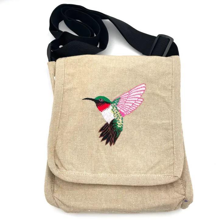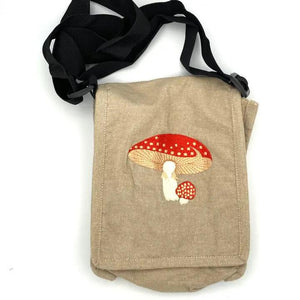 Your next adventuring bag! These bags are made of 100% handloomed cotton and come on a 1.5" nylon webbing strap. There's enough room for all your stuff between the main compartment, back zipper pocket, and pencil side pocket. Pick your favorite embroidered animal, plant, or mushroom!