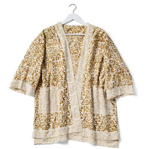 The perfect outfit completer! This 100% cotton topper is hand block printed with vegetable-based dyes (a traditional Indian fabric called kalamkari). Sleeves are 3/4 length and the kimono has two front pockets. Machine wash cold separately, line dry.